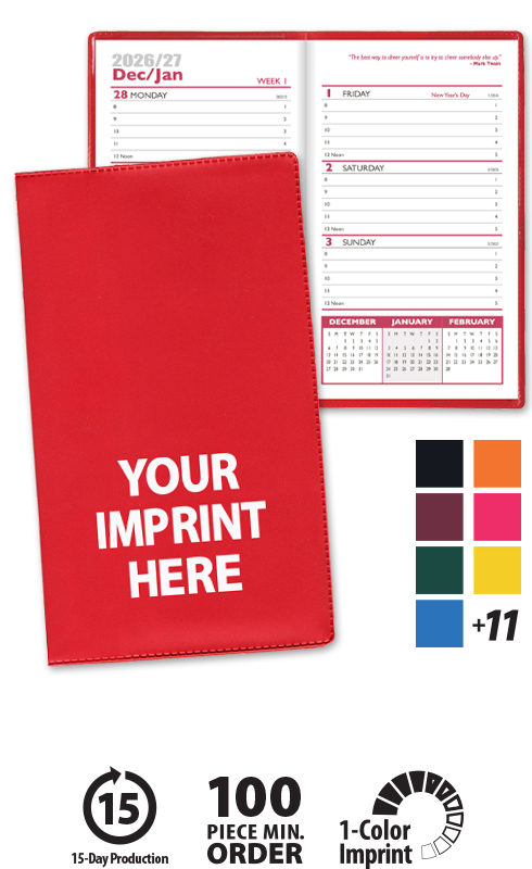 This high-quality custom branded weekly pocket planner will proudly display your logo and brand messaging for the entire year!