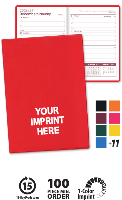 NOTE: The planner year can be added to the front cover but must fit within the product's available imprint area.
