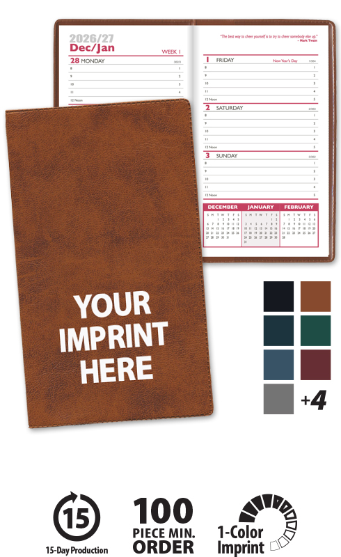 This high-quality custom branded weekly pocket planner will proudly display your promotional advertising message for the entire year!