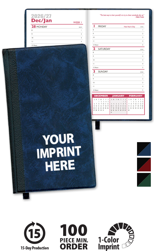 This high-quality custom printed weekly pocket planner will proudly display your logo and brand messaging for the entire year!