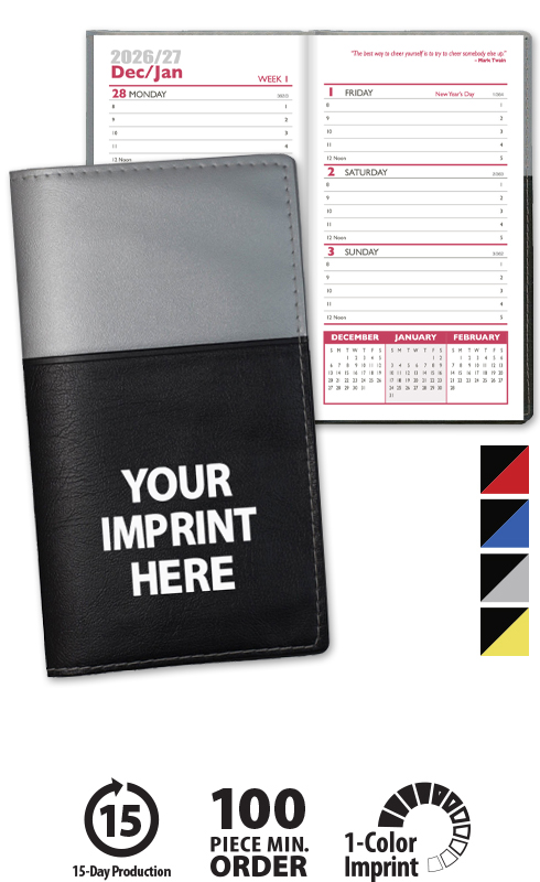 This high-quality customized weekly pocket planner will proudly display your promotional advertising message for the entire year!