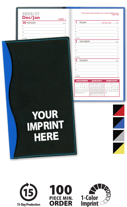 This high-quality custom branded weekly pocket planner will proudly display your promotional advertising message for the entire year!