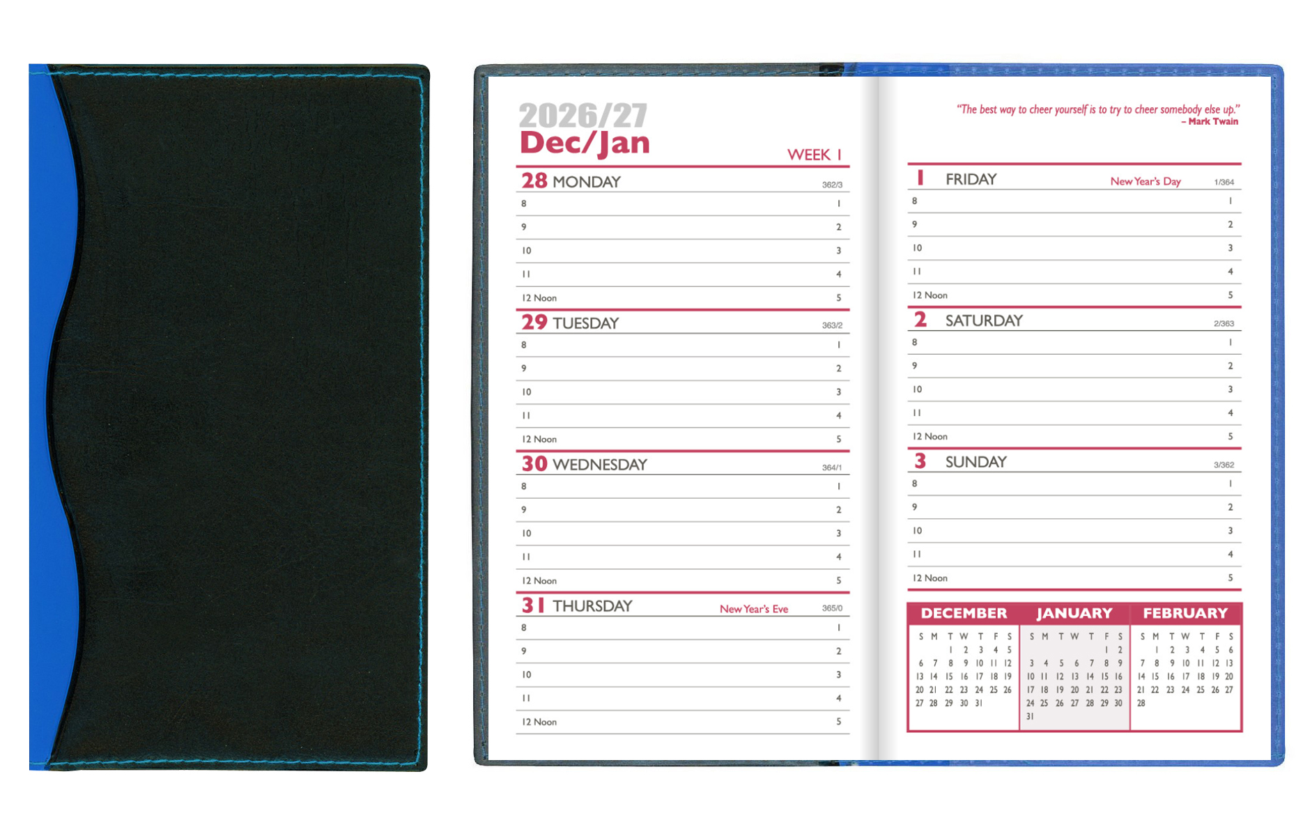 Stay organized throughout the year with this contemporary 14-month weekly pocket planner featuring a sleek black vinyl jacket cover and bold wave accent design. The Holland Series planner offers a modern, eye-catching look that makes it a great promotional planner for managing schedules, meetings, and daily tasks.