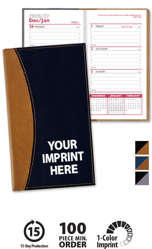 Stay organized throughout the year with this stylish 14-month weekly pocket planner featuring a modern two-tone vinyl jacket cover and distinctive curved accent design. The Normandy Series planner offers a refined, contemporary look that makes it an excellent promotional planner for managing schedules, meetings, and daily tasks.