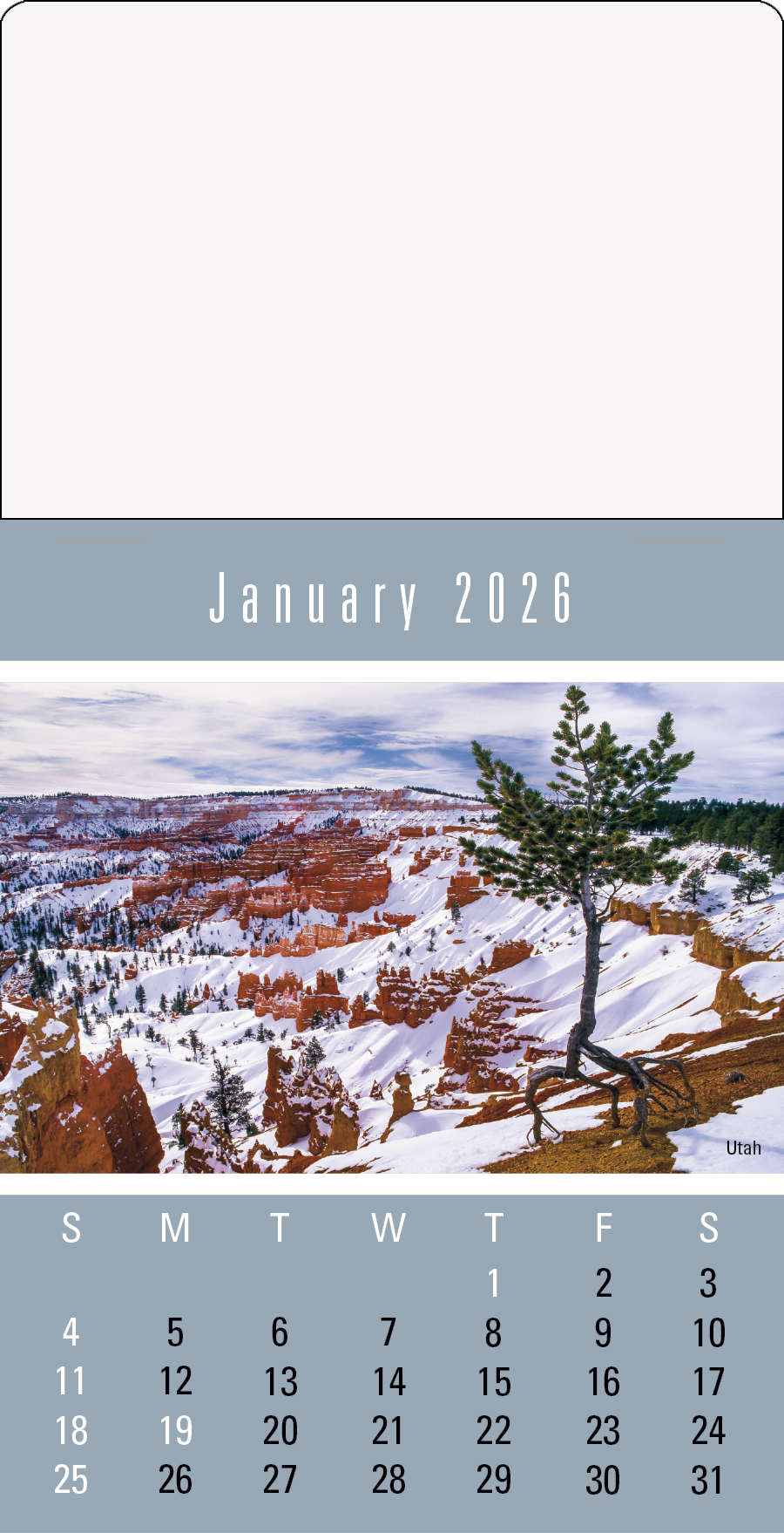 This 13-month, full-color calendar pad features 13 breathtaking scenic images sure to leave a smile on your customer's face! Includes your choice of white vinyl header shape, printed in vibrant full color. The standard 4-color process imprinting is perfect for custom logos, photos & colorful background designs sure to draw attention and help your message stand out. A great way to stay connected with your valued customers. Proudly made in the USA. Press-n-Stick™ Calendars feature a special adhesive that allows the vinyl to be stuck on almost any surface and then easily removed with no residue!
