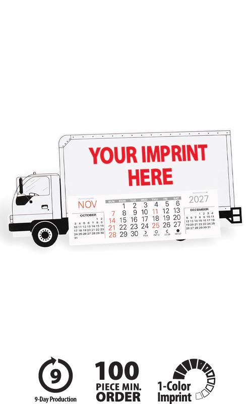 This high-quality custom printed Delivery Truck Desk Calendar will proudly display your personalized promotional message for the entire year!