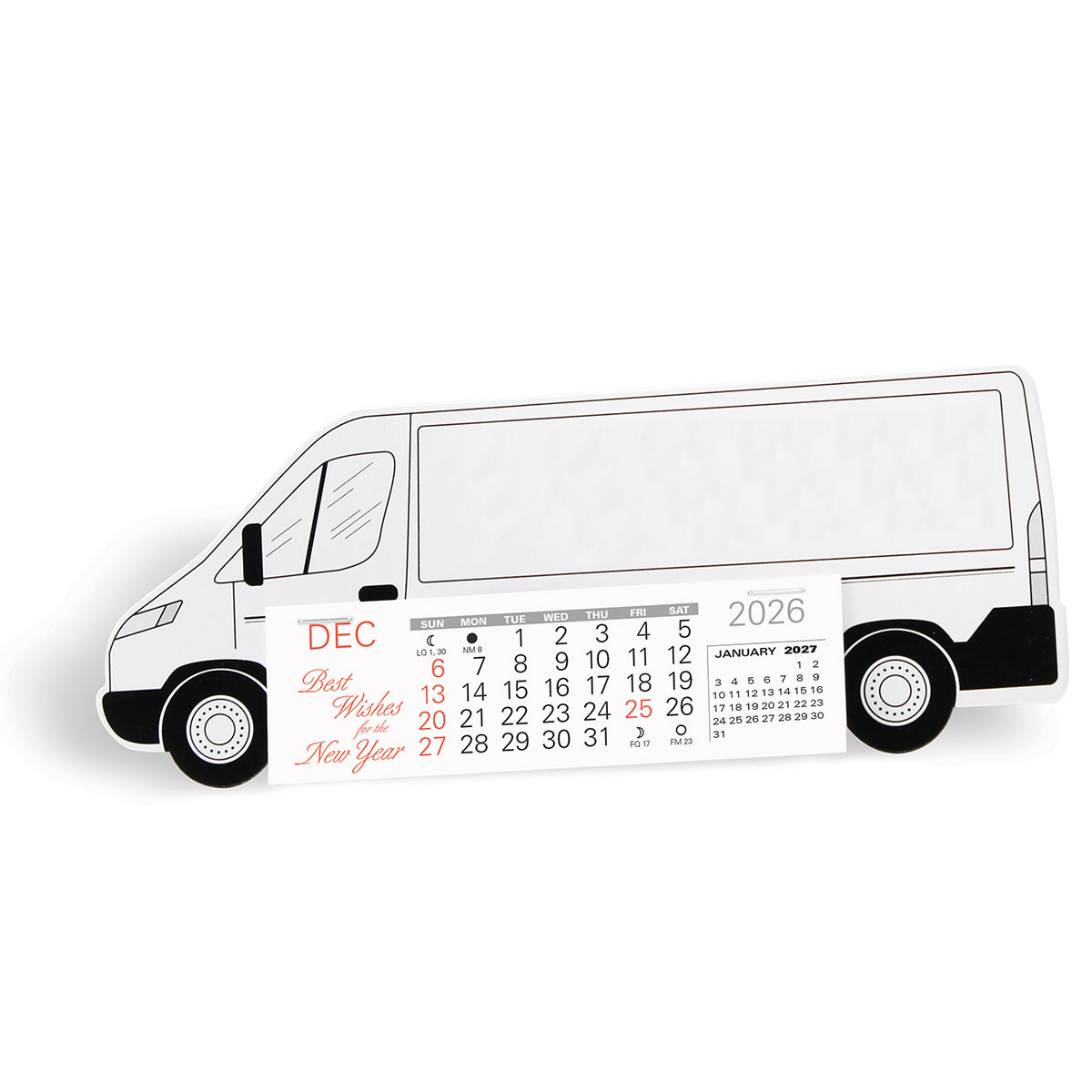Keep your brand in motion with a service van desk calendar that reflects the daily grind of technicians while putting your message in front of customers all year long. The Working Wheels desk calendar is crafted from durable chipboard with a clean white vehicle design, accented by bold black tire details and pop-out easel for easy desk or countertop display, finished with your one-color red imprint for consistent brand visibility.