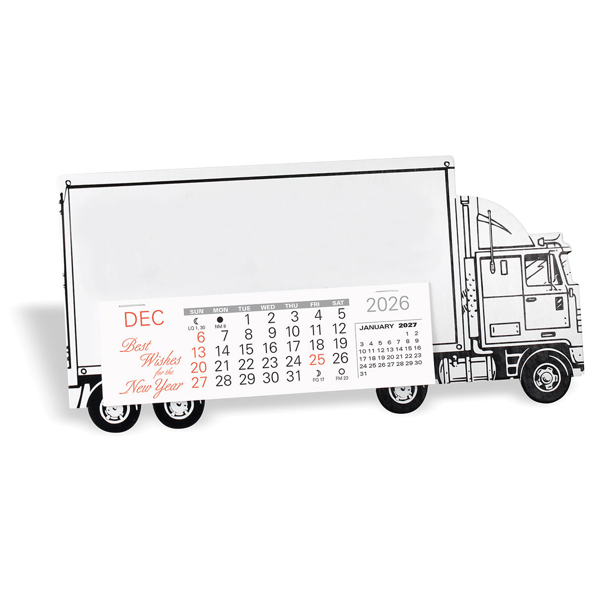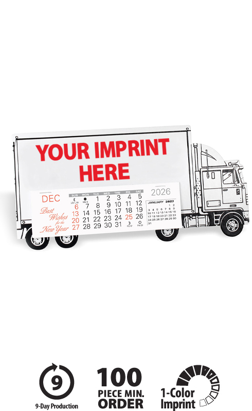 Make a lasting impression with a tractor trailer desk calendar that combines long-haul strength with year-round brand visibility. The Working Wheels desk calendar is crafted from durable chipboard with a clean white vehicle design, accented by bold black tire details and pop-out easel for easy desk or countertop display, finished with your one-color red imprint for consistent brand visibility.